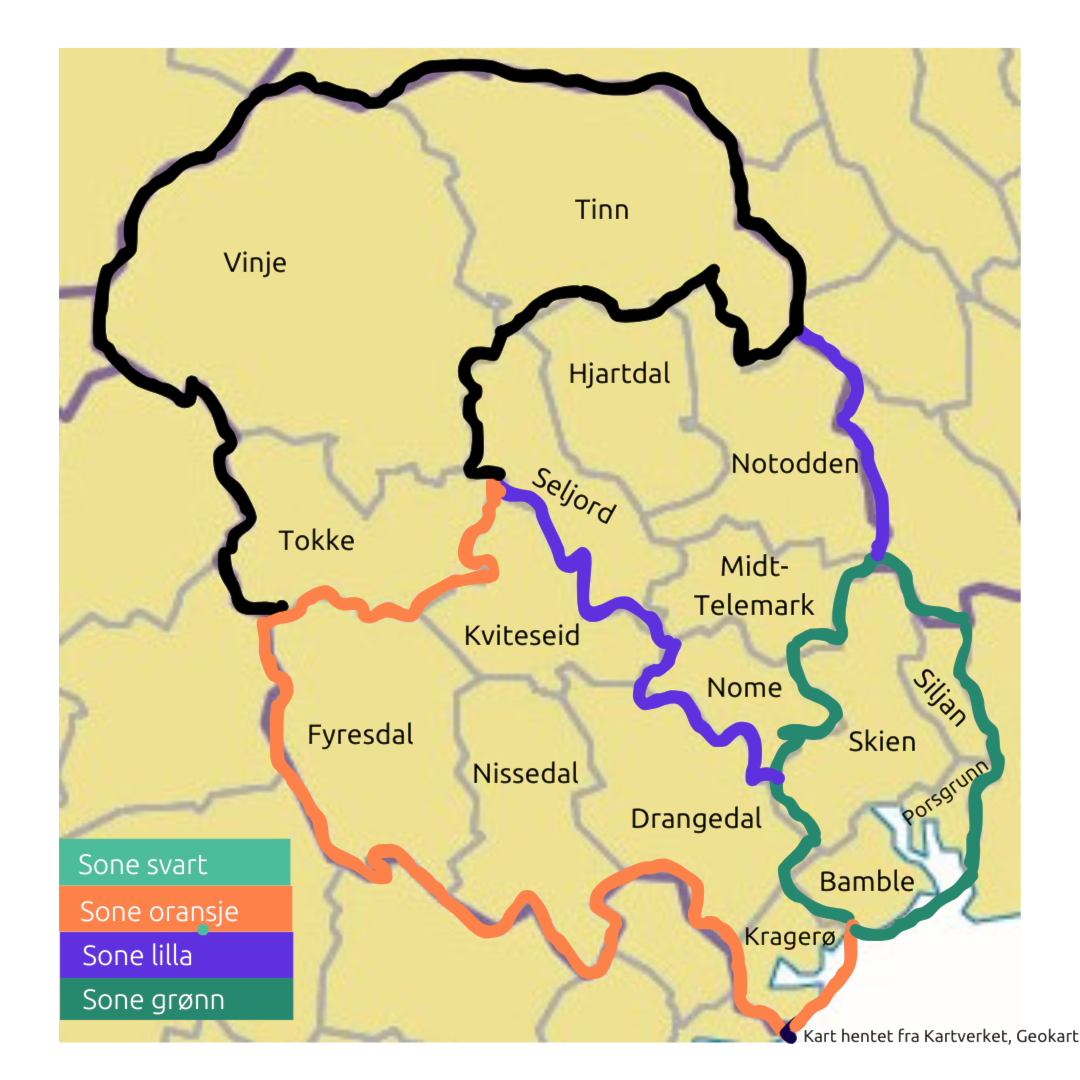 Turene er spredd ut over Telemark, delt inn i fire soner. Sonene kaller vi sone svart, sone oransje, sone grønn og sone lilla. Du kan se et sonekart lenger ned på siden.